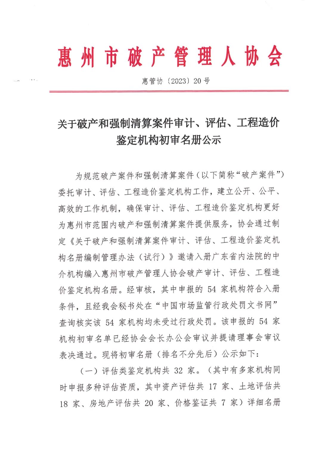 关于破产和强制清算案件审计、评估、工程造价鉴定机构初审名册公示