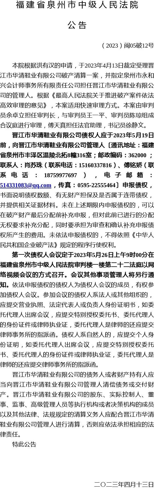 晋江市华清鞋业有限公司破产清算一案裁定受理公告