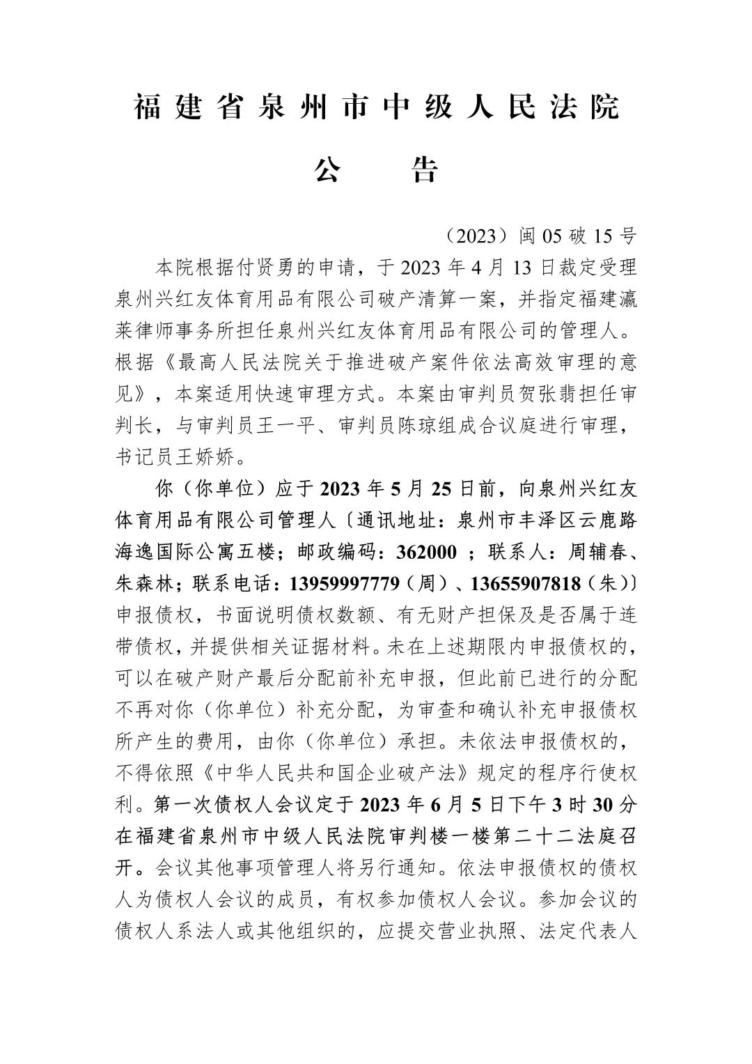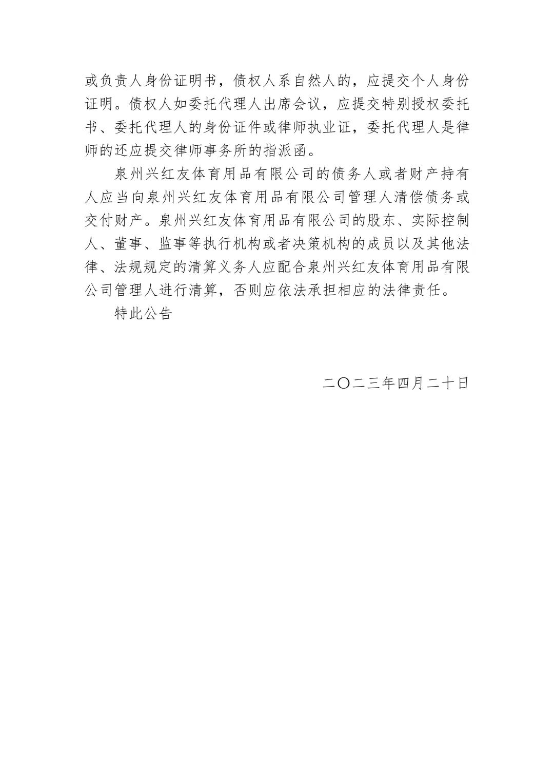 泉州兴红友体育用品有限公司破产清算案裁定受理公告