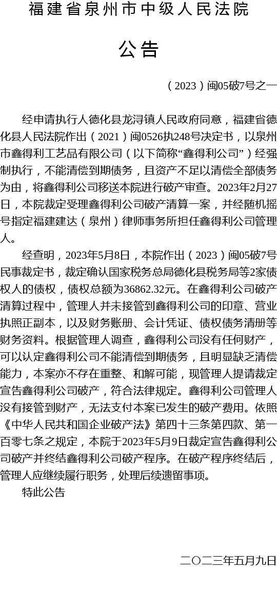 裁定宣告泉州市鑫得利工艺品有限公司破产并终结破产程序