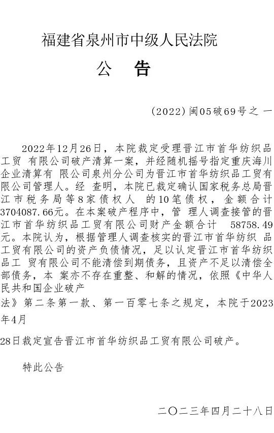 裁定宣告晋江市首华纺织品工贸有限公司破产