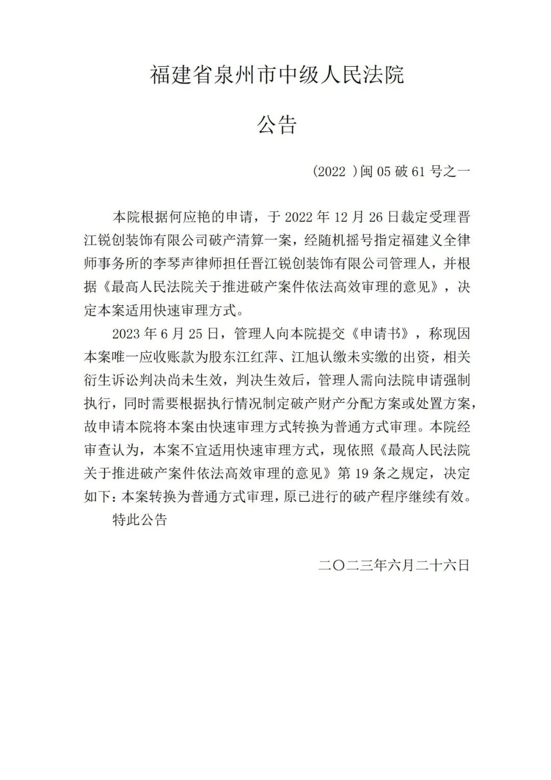 晋江锐创装饰有限公司破产清算案转为普通方式审理的公告
