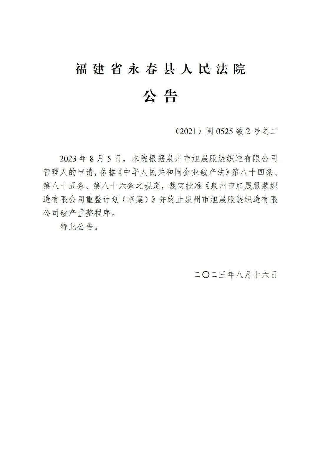 裁定批准《泉州市旭晟服装织造有限公司重整计划(草案)》并终结破产重整程序的公告