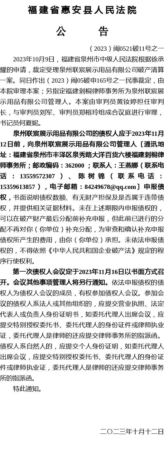 泉州联宸展示用品有限公司破产清算一案受理公告