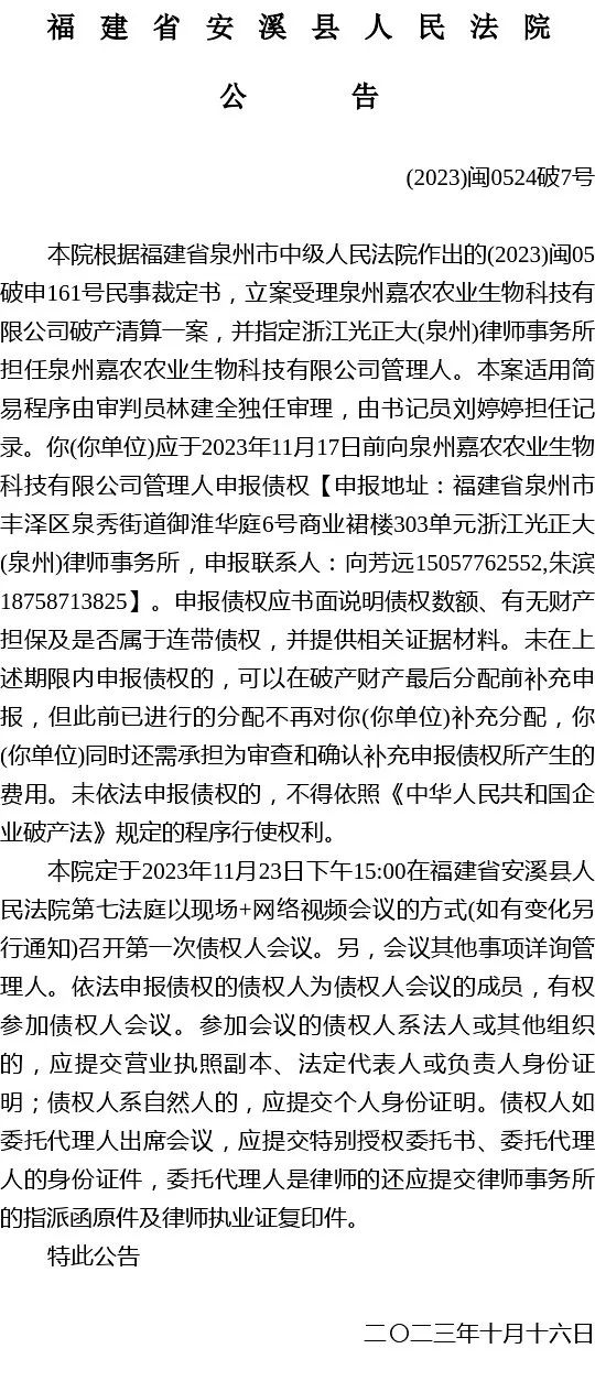 泉州嘉农农业生物科技有限公司破产清算一案受理公告