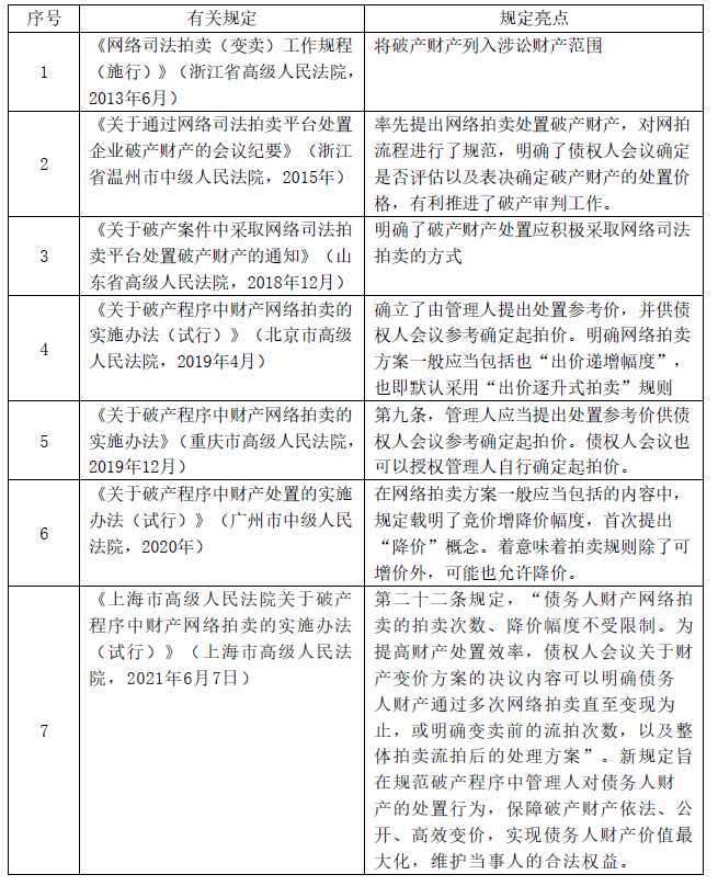 面对破产拍卖领域制度层面顶层设计的缺失,越来越多的地方法院为更好的解决问题,结合破产案件审理的实际情况,积极发挥能动性,陆续出台了破产财产网络拍卖的规定。