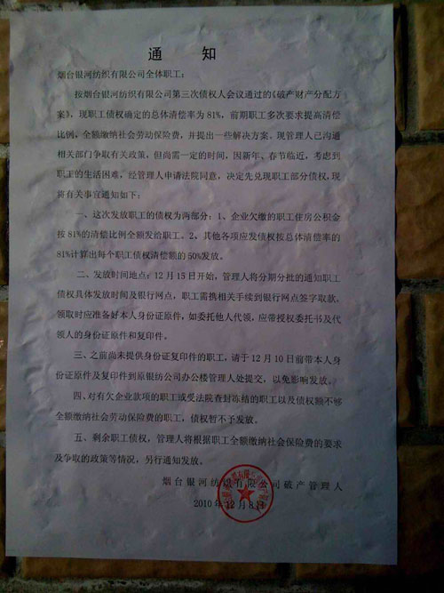 烟台银河纺织有限公司破产一案,因职工债权不能全额清偿,职工多次要求提高清偿比例,并提出一些解决方案。现管理人已沟通相关部门争取有关政策,但尚需一定的时间,因新年、春节临近,考虑到职工的生活困难,经申请法院同意,决定先兑现职工部分债权,现将有关事宜通知如下: