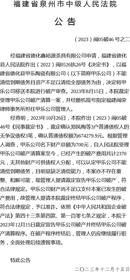 宣告福建省德化县甲乐陶瓷有限公司破产并终结破产清算程序