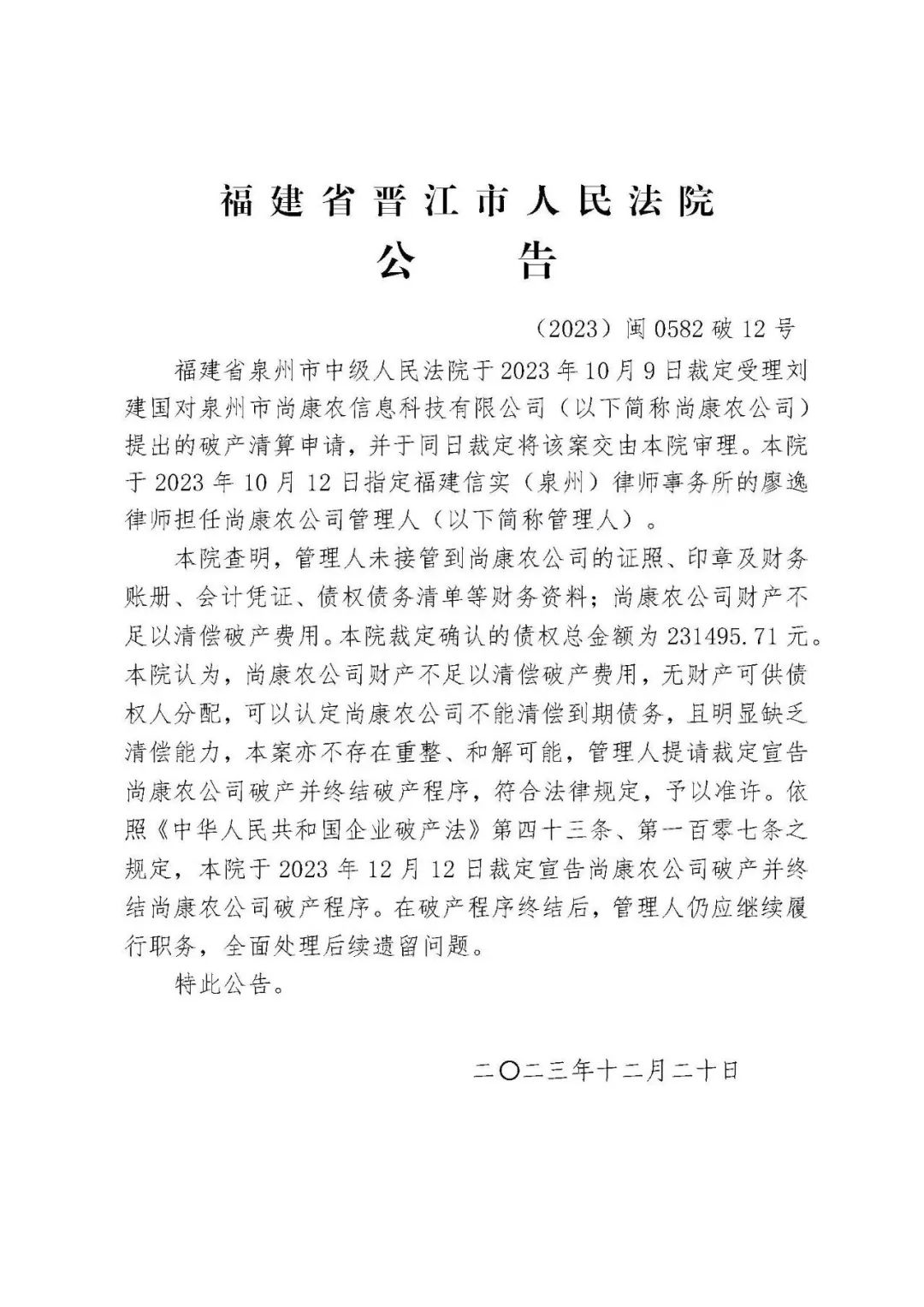 裁定宣告泉州市尚康农信息科技有限公司破产并终结破产程序