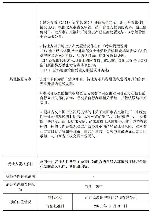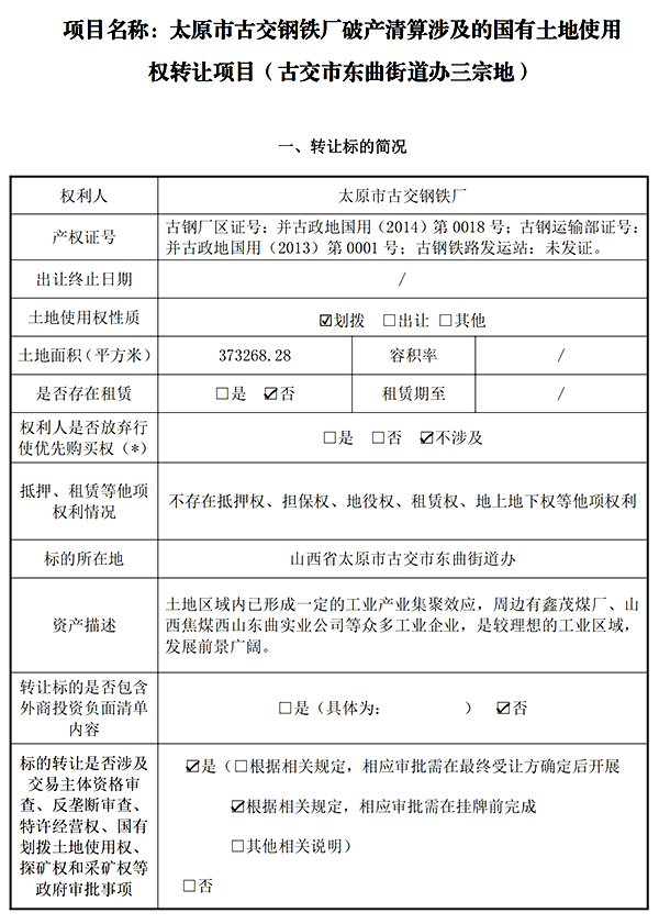 太原市古交钢铁厂破产清算涉及的国有土地使用权转让项目(古交市东曲街道办三宗地)