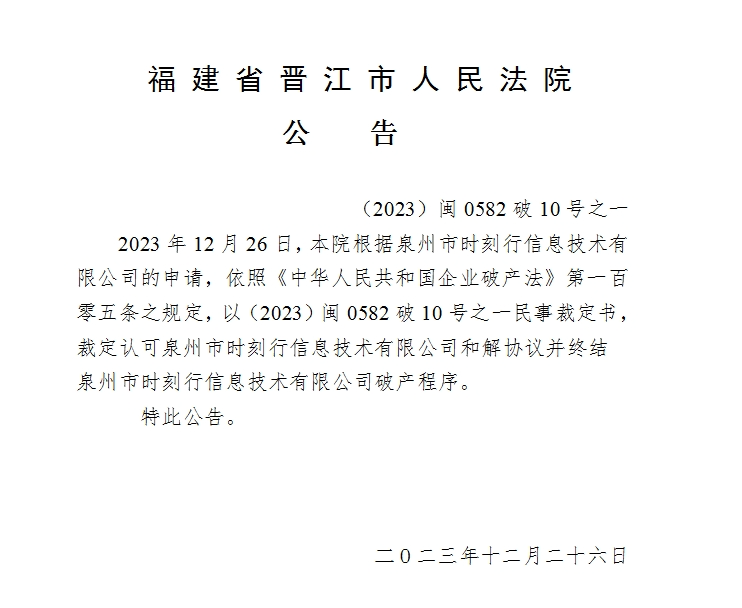 裁定认可泉州市时刻行信息技术有限公司和解协议并破产程序