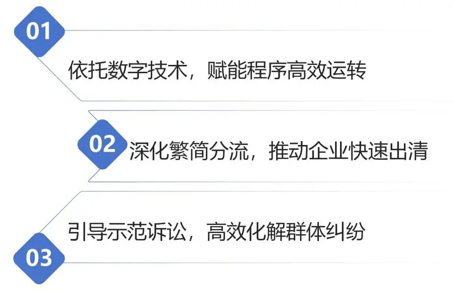 三是引导示范诉讼,高效化解群体纠纷。为避免大量破产衍生诉讼拉长纠纷化解周期,出台《关于探索破产衍生纠纷诉源治理 积极引导示范诉讼的工作方案》,实现“一事一诉”到“惜诉慎诉”的理念转变。督导管理人选取最具代表性的纠纷提起诉讼,并适用示范诉讼机制,充分发挥债权人会议自治功能,以“非诉”方式解决其他相似纠纷,实现“诉讼一个、解决一片”的效果。该方案出台仅一个多月,已运用示范诉讼机制成功化解潜在衍生诉讼150余件,涉案金额约1.5亿元。