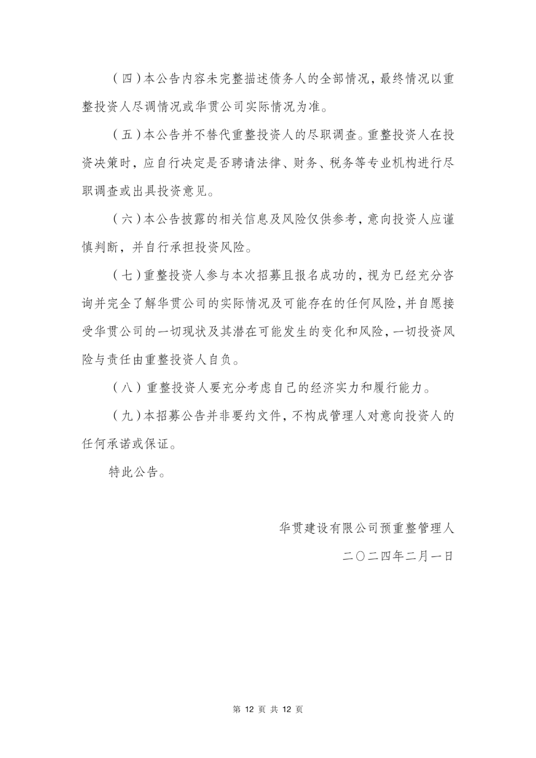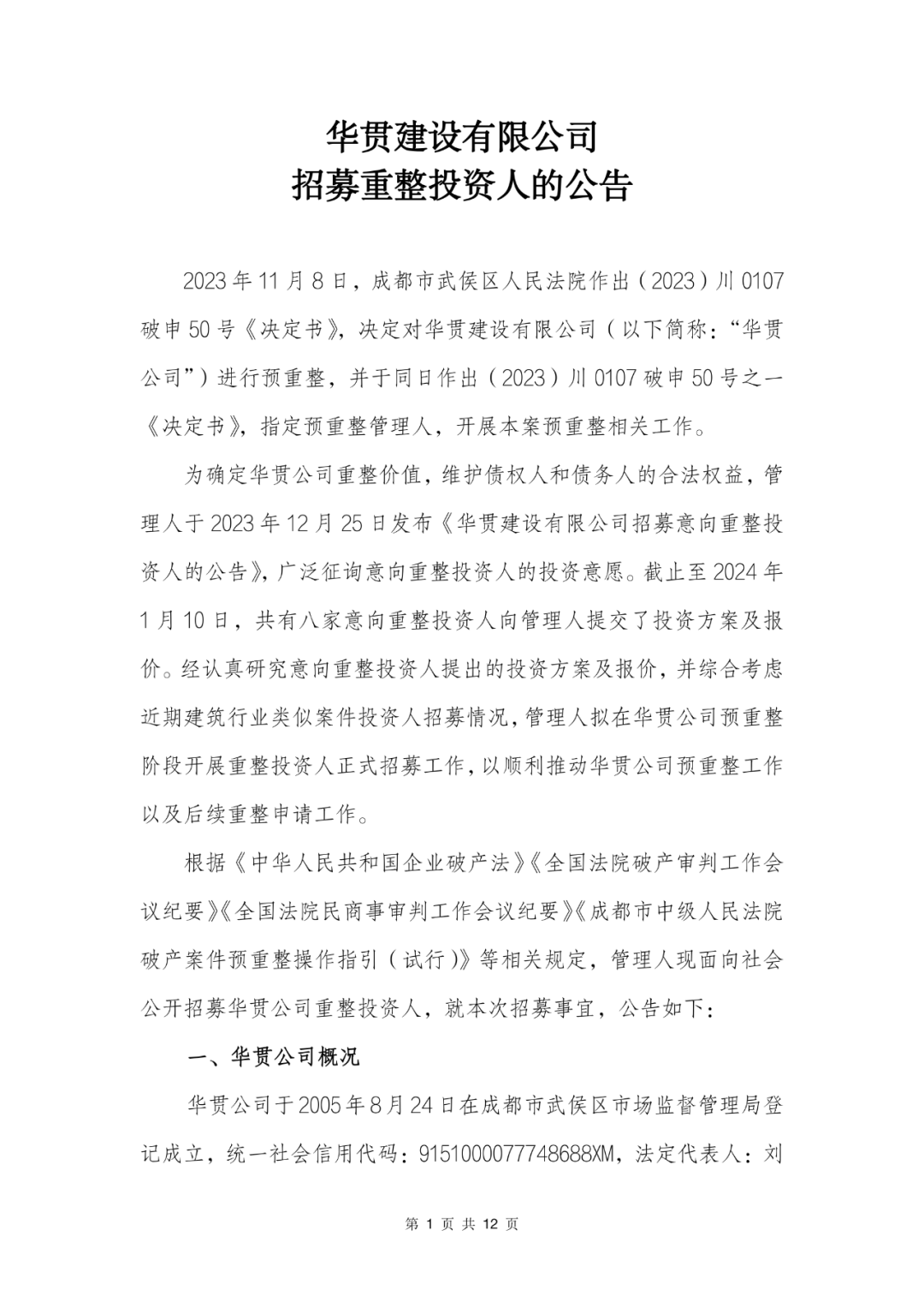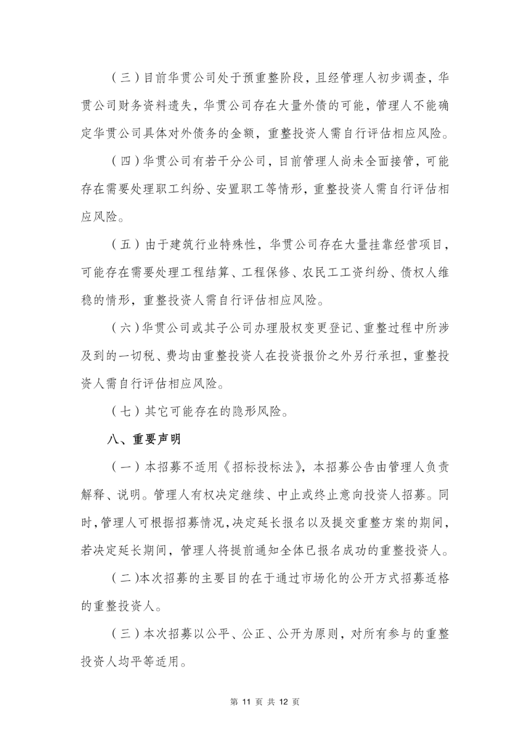 华贯建设有限公司招募重整投资人的公告