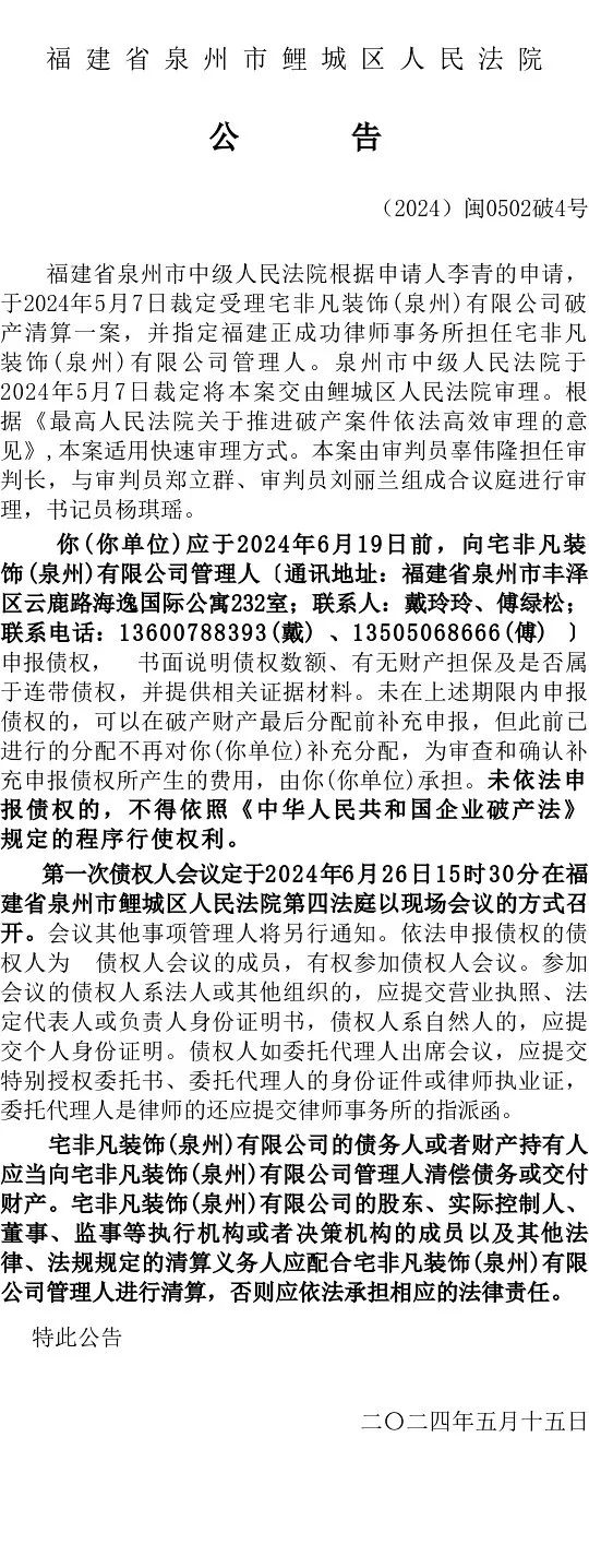 宅非凡装饰(泉州)有限公司破产清算案受理及第一次债权人会议公告
