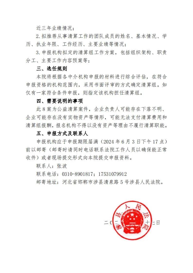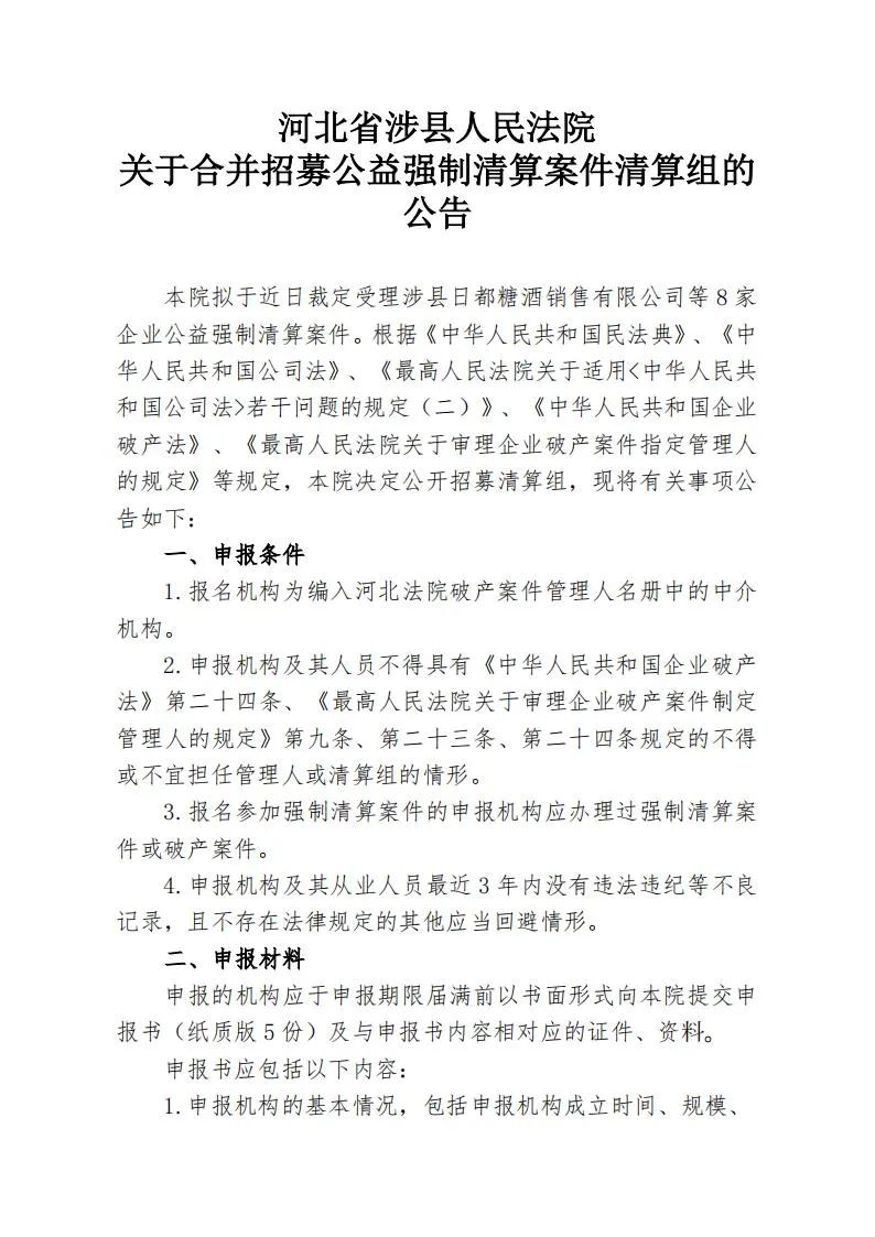 河北省涉县人民法院关于合并招募公益强制清算案件清算组的公告