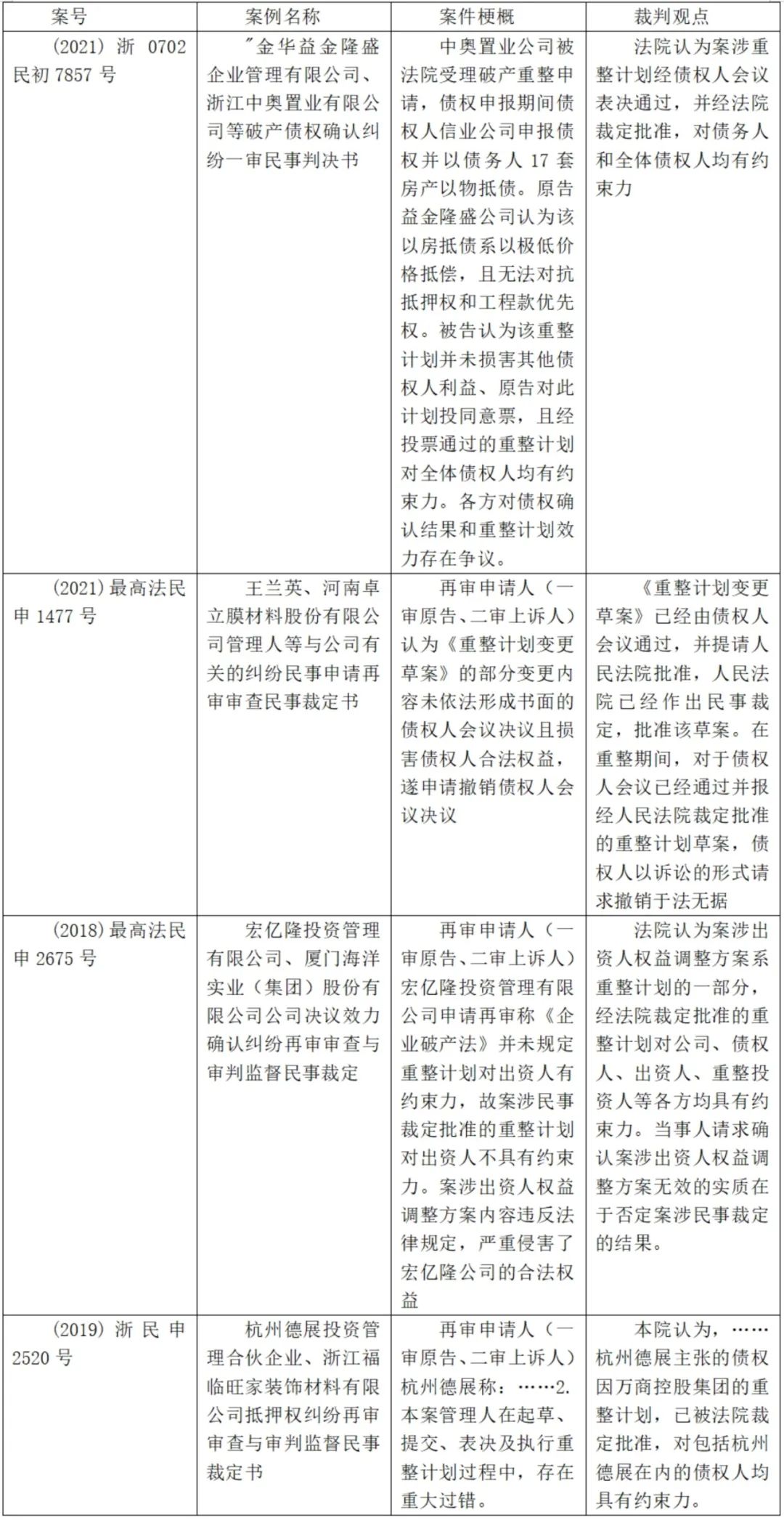 通过对上述案例的整理归纳,笔者认为,在实务中法院对于当事人就重整计划提出的异议的处理方式,有以下三大问题:一是法院审查重整计划的结果为裁定批准与否,并可附指导意见或进行法律审查的意见,但法院是否可以替代债务人、管理人行权,直接形成重整计划草案或直接对重整计划草案进行修改未有结论;二是实务中法院对于当事人因重整计划和重整裁定提起的诉讼,详细审查具体的诉讼请求,但对于重整计划和重整裁定的可诉性并不直接回应。利害关系人认为具有法律效力的重整计划和重整裁定损害其合法权益,法院也并未回应和释明如何解决前述争议;三是实践中已有不少利害关系人对于经通过和批准的重整计划提出异议的的案例,但并无一例异议成功。