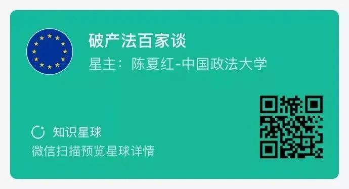 敬告:本公号由中国政法大学破产法与企业重组研究中心维护。感谢你我互粉,期待惠赐大作(邮箱:insolalerts@126.com)。欢迎加入“破产法快讯”微信群(加insol100,报姓名机构),欢迎扫码加入知识星球“破产法百家谈”: