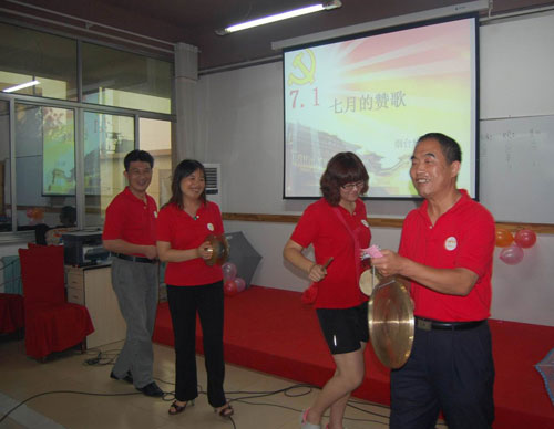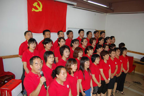 接下来党总支组织全体党员在党旗下重温了入党誓词。全场高唱《歌唱祖国》、《没有共产党就没有新中国》、《团结就是力量》等歌曲。