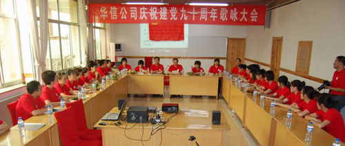 活动会场,气氛庄重而热烈,舞台上方悬挂着“华信公司庆祝建党成立90周年”的会标,舞台背景高挂着鲜红的党旗。
