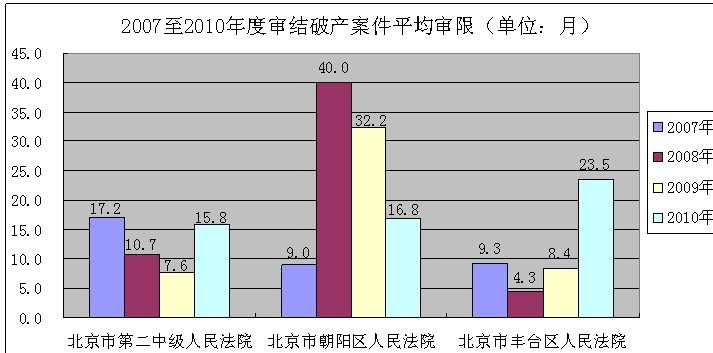 从北京市第二中级人民法院、北京市朝阳区人民法院、北京市丰台区人民法院2007至2010年度审结的破产案件审限看,破产立案后的审理期限具有审限长、个案差异大、结案日期集中等特点。