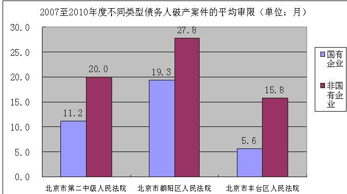 二是个案差异较大。通过对2007至2010年度已结案件的分析发现,破产案件的审限因个案不同而有较大差异。就个案来说,北京市第二中级人民法院已审结案件中审限最长达53.5月,最短仅为58天,北京市朝阳区人民法院已结案件中审限最长达35.5月,最短仅为7天。北京市丰台区人民法院已结案件中审限最长达115月,最短仅为6天,不同案件的审限差异非常明显。就案件类型来说,国有企业破产案件与非国有企业破产案件的审理期限也有大不相同,一般来说,后者要长于前者。