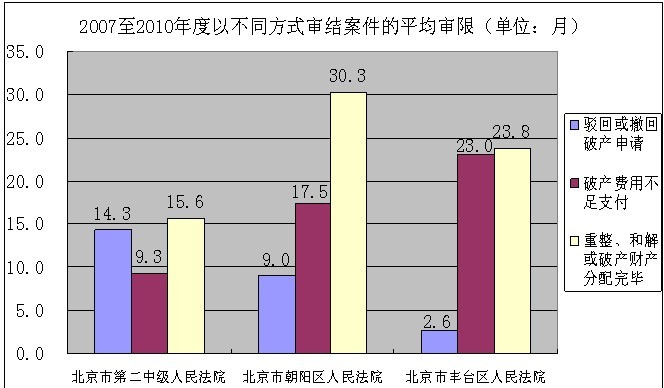 一是审理期限长。就北京市第二中级人民法院、北京市朝阳区人民法院、北京市丰台区人民法院2007至2010年度审结的破产案件来说,从整体上看,与普通民商事案件审限相比,破产案件的审限过长、时间跨度过大。就个案来说,北京市第二中级人民法院2003年6月27日受理的某国有企业破产案审结于2007年12月13日,历时近4年半,北京市朝阳区人民法院2000年8月21日受理的某有限公司破产案审结于2009年12月2日,历时9年多,北京市丰台区人民法院2007年6月1日受理的某有限公司破产案审结于2010年5月19日,历时近3年。