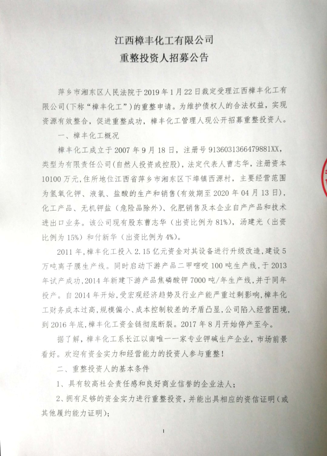 据了解,樟丰化工系长江以南唯一一家专业钾碱生产企业,市场前景看好。欢迎有资金实力和经营能力的投资人参与重整!