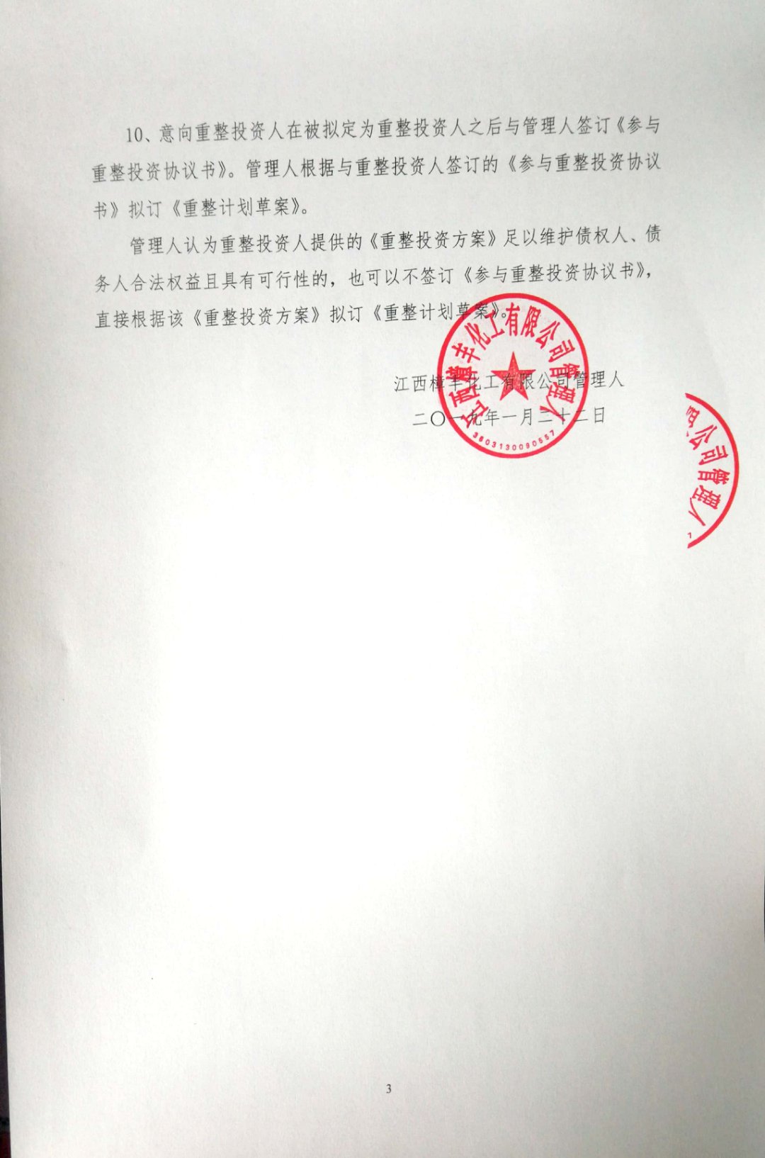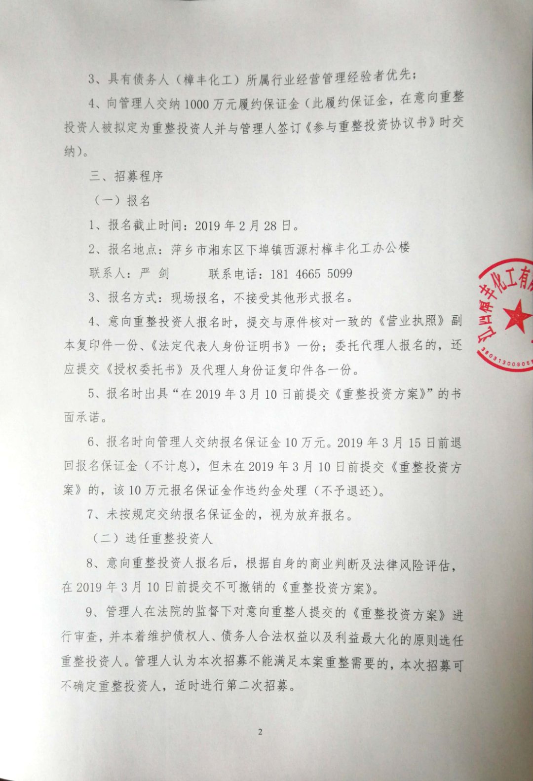 萍乡市湘东区人民法院于2019年1月22日裁定受理江西樟丰化工有限公司(下称“樟丰化工”)的重整申请。为维护债权人的合法权益,实现资源有效整合,促进重整成功,樟丰化工管理人现公开招募重整投资人。