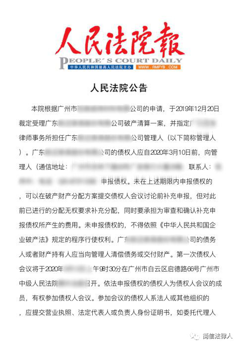 若能查询到这样的公告,则可确认企业已进入破产程序。在阅读公告时,应充分注意以下几点核心要素:(1)破产案件由哪个法院管辖(投诉、维权有门);(2)法院受理破产申请的时间(将影响债权利息的计算);(3)法院指定的破产管理人及其联系方式(日后债权能收回多少,基本就靠他们了);(4)申报债权的时间(为避免权利受损,应在法院指定的时限内申报债权);(5)第一次债权人会议的时间、地点(准时参加债权人会议,了解债务人的资产负债情况)。