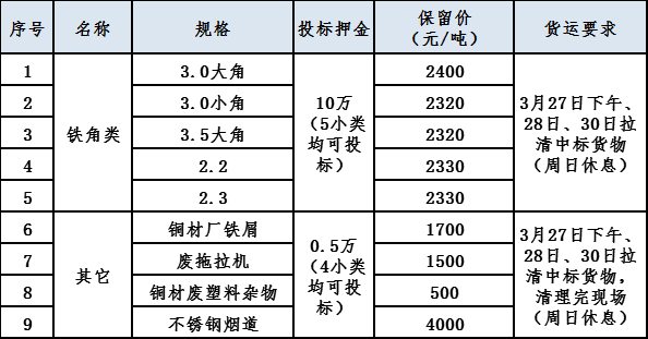 本次招标根据不同废料物资的种类设置了相应的押金数额,投标人应根据要求交纳押金。投标人将押金汇入管理人账户后,即可取得投标资格。投标押金交纳截止时间为2020年3月27日上午9点。投标押金汇款账户如下: