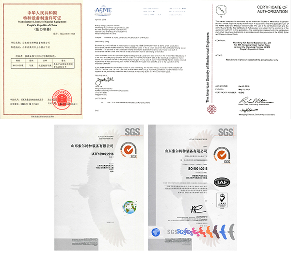 3.索尔公司已取得国家质量技术监督检验检疫总局颁发的B4级焊接气瓶制造许可证、ASME认证、TPED认证,IATF 16949、IS0 9001、IS0 14001、IS0 45001认证。