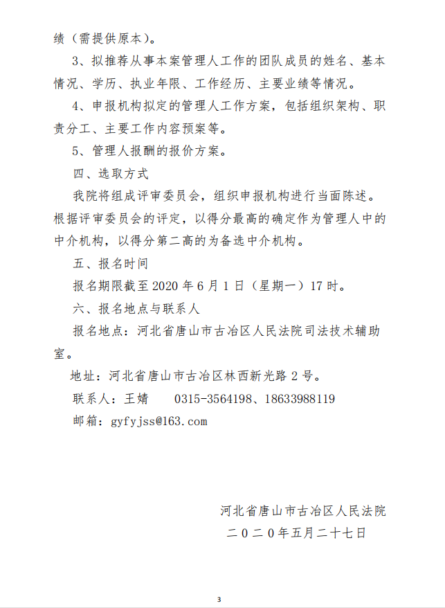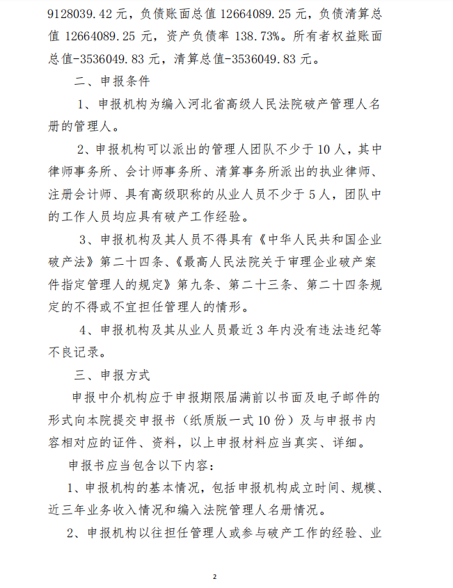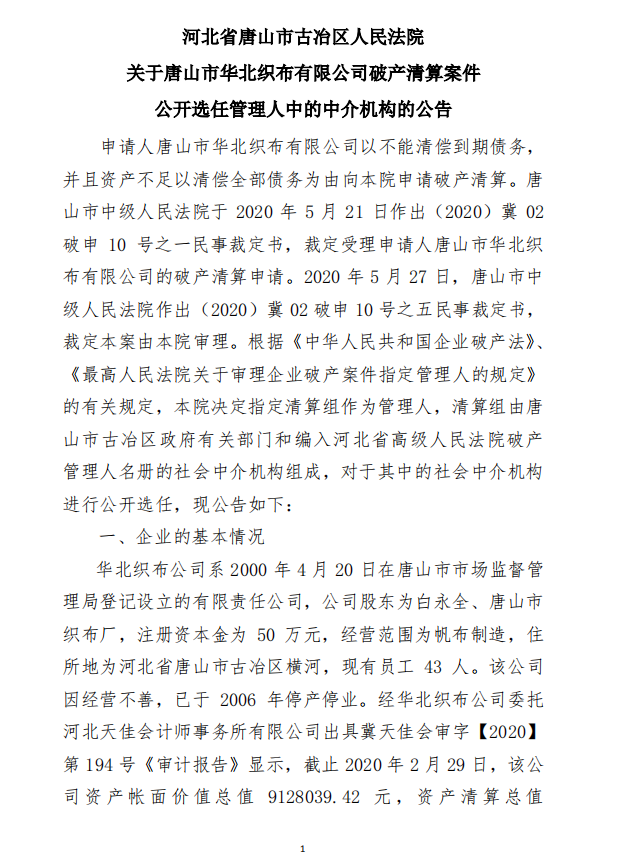 唐山市华北织布有限公司破产清算案件公开选任管理人中的中介机构的公告