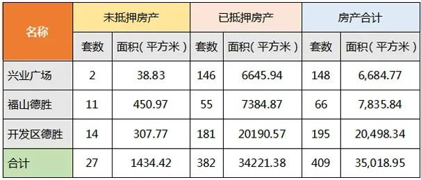 德胜公司名下的房产,共409套,建筑面积合计35,018.95平方米,评估清算价值122,558,897.50元,主要用途为商业用房,房产分别位于芝罘区德胜兴业广场、福山区德胜商城、开发区德胜商城,房产均已建设完工并投入使用多年。410套中,有382套房产已设定抵押。明细情况如下: