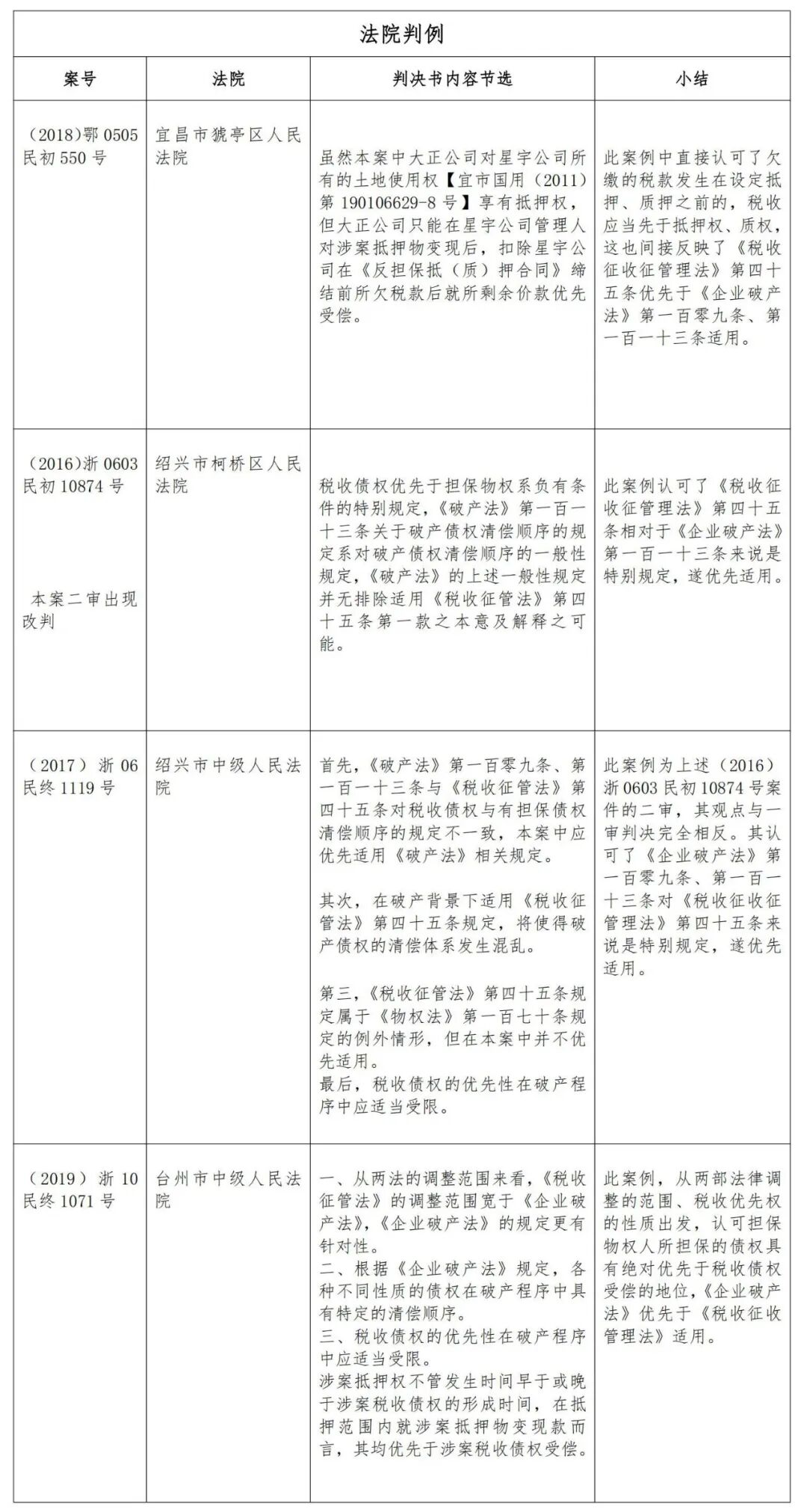 也有观点认为《税收征收管理法》第四十五条调整的是正常经营企业和破产企业,而《企业破产法》调整的是破产企业,调整范围相对较窄,《企业破产法》应当优先适用;还有观点从立法背景、立法精神,市场经济稳定等宏观方面考虑,得出的结论也各有不同。但归根结蒂都是针对《企业破产法》与《税收征收管理法》冲突时,孰先适用的争论。