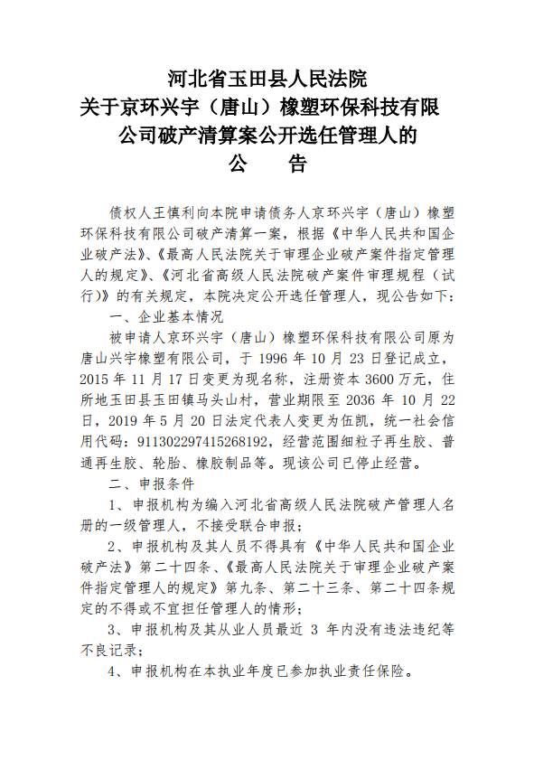 关于京环兴宇(唐山)橡塑环保科技有限公司破产清算案公开选任管理人的公告