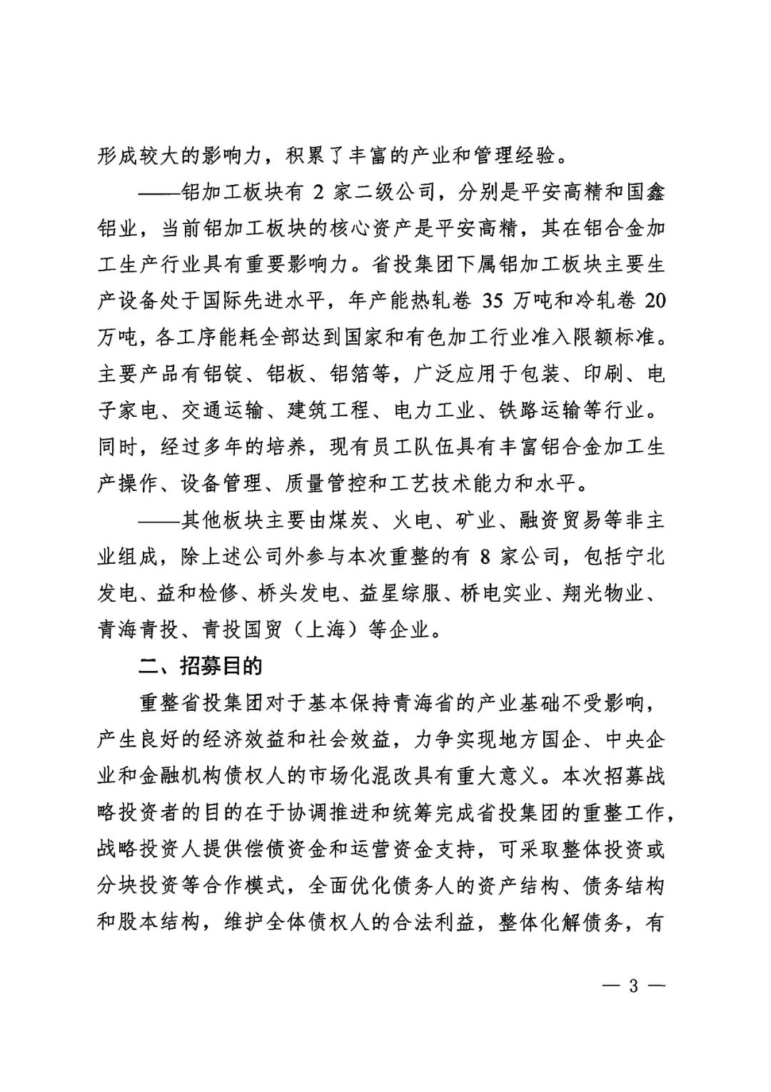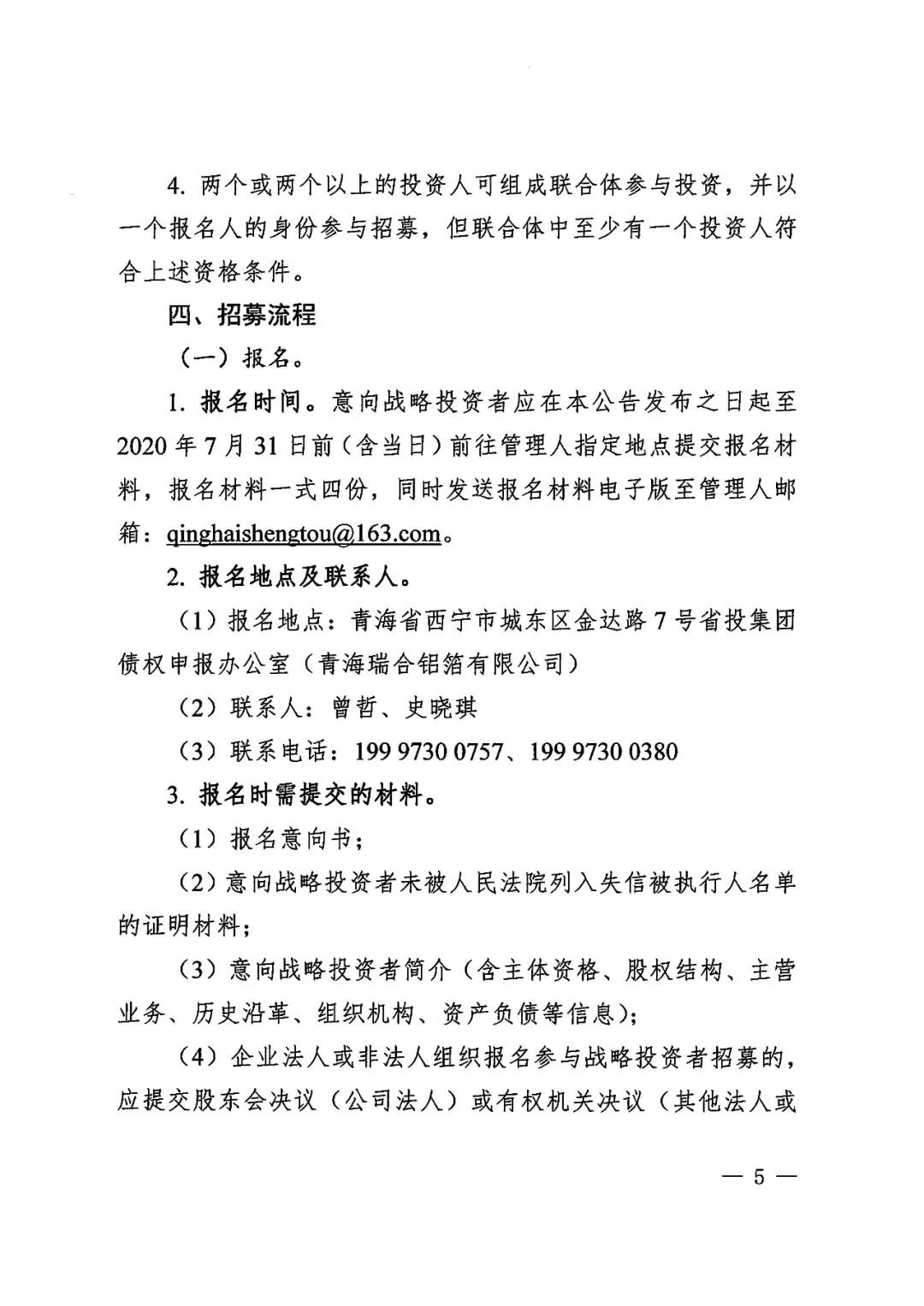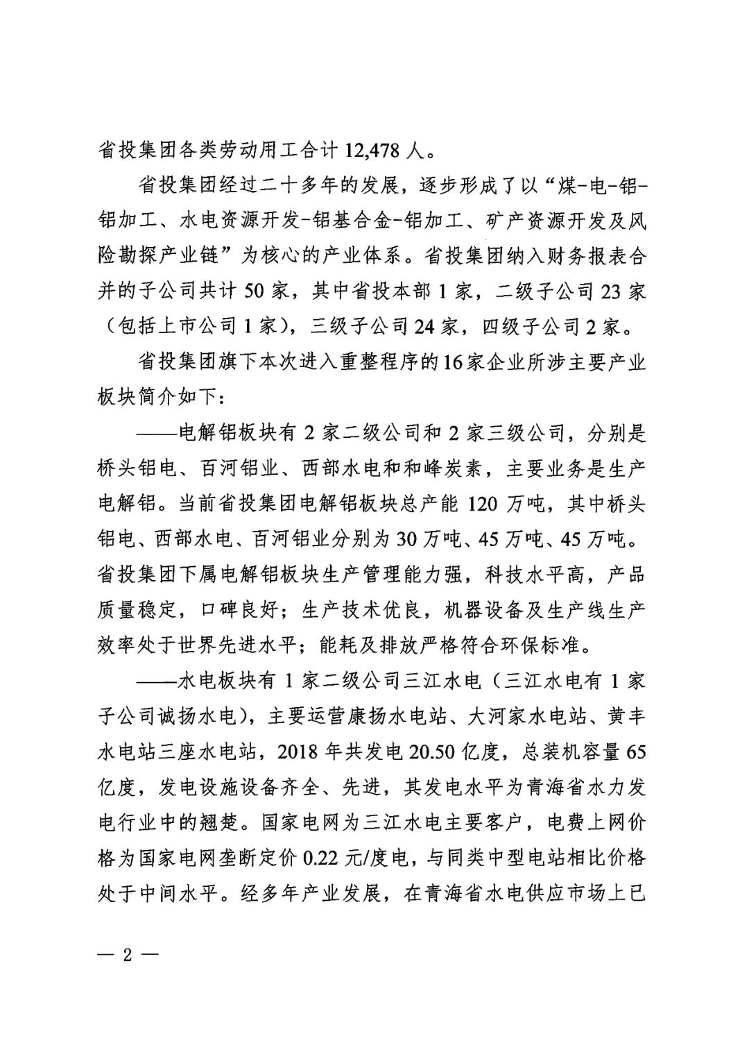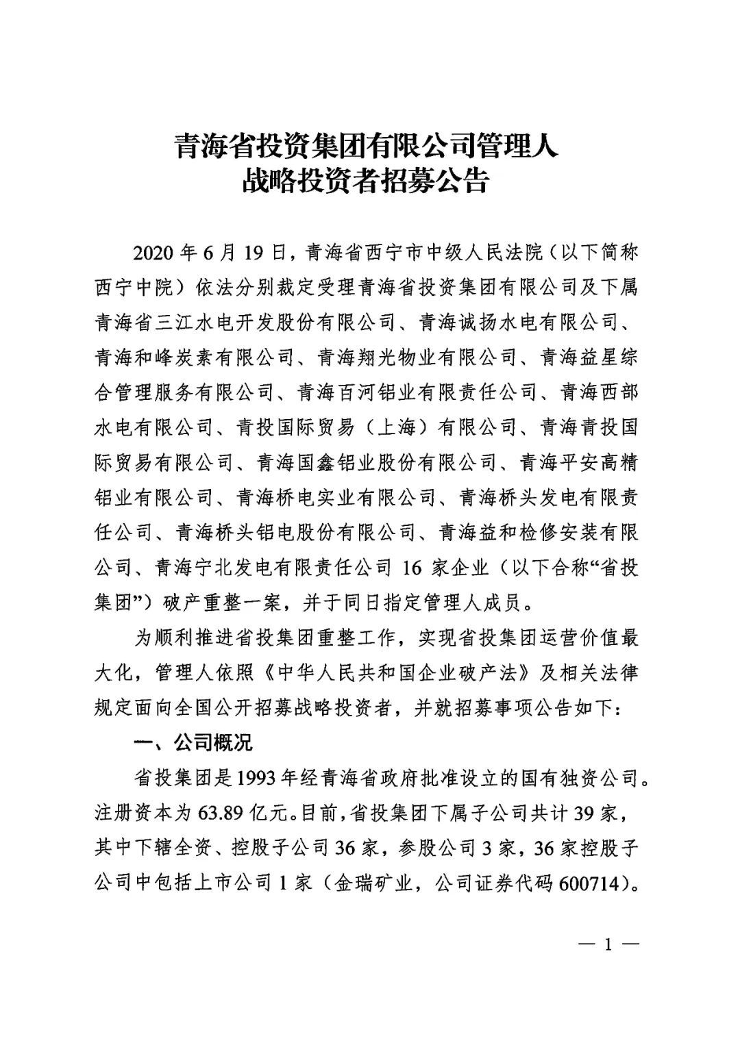 2020年6月19日,青海省西宁市中级人民法院依法分别裁定受理青海省投资集团有限公司及下属青海省三江水电开发股份有限公司、青海诚扬水电有限公司、青海和峰炭素有限公司、青海翔光物业有限公司、青海益星综合管理服务有限公司、青海百河铝业有限责任公司、青海西部水电有限公司、青投国际贸易(上海)有限公司、青海青投国际贸易有限公司、青海国鑫铝业股份有限公司、青海平安高精铝业有限公司、青海桥电实业有限公司、青海桥头发电有限责任公司、青海桥头铝电股份有限公司、青海益和检修安装有限公司、青海宁北发电有限责任公司16家企业(以下合称“省投集团”)破产重整一案,并于同日指定管理人成员。为顺利推进省投集团重整工作,实现省投集团运营价值最大化,管理人依照《中华人民共和国企业破产法》及相关法律规定面向全国公开招募战略投资者,报名截止日期为2020年7月31日前(含当日),联系人为曾哲、史晓琪(199 9730 0757、199 9730 0380)。