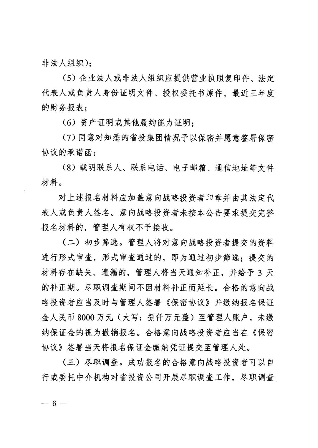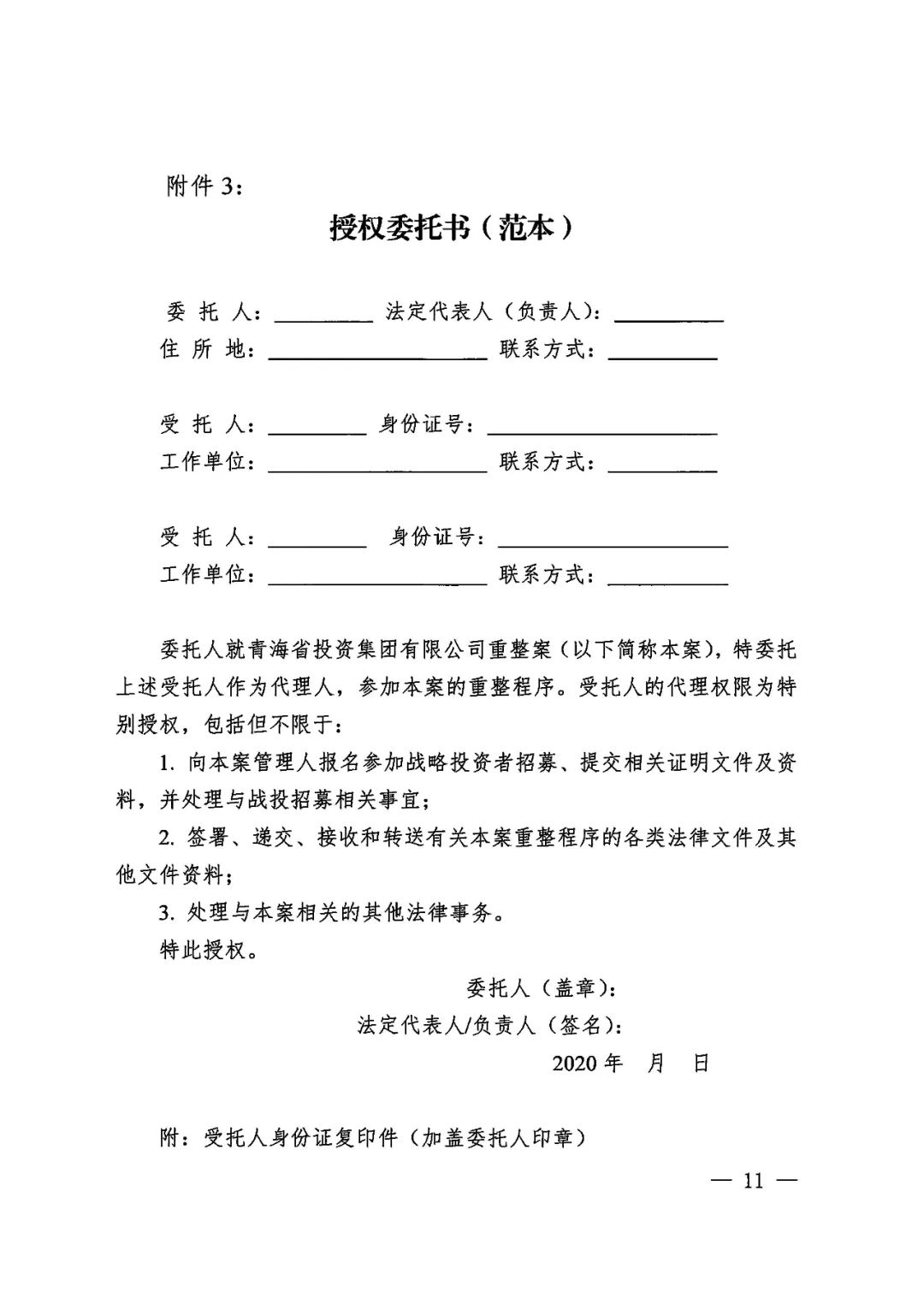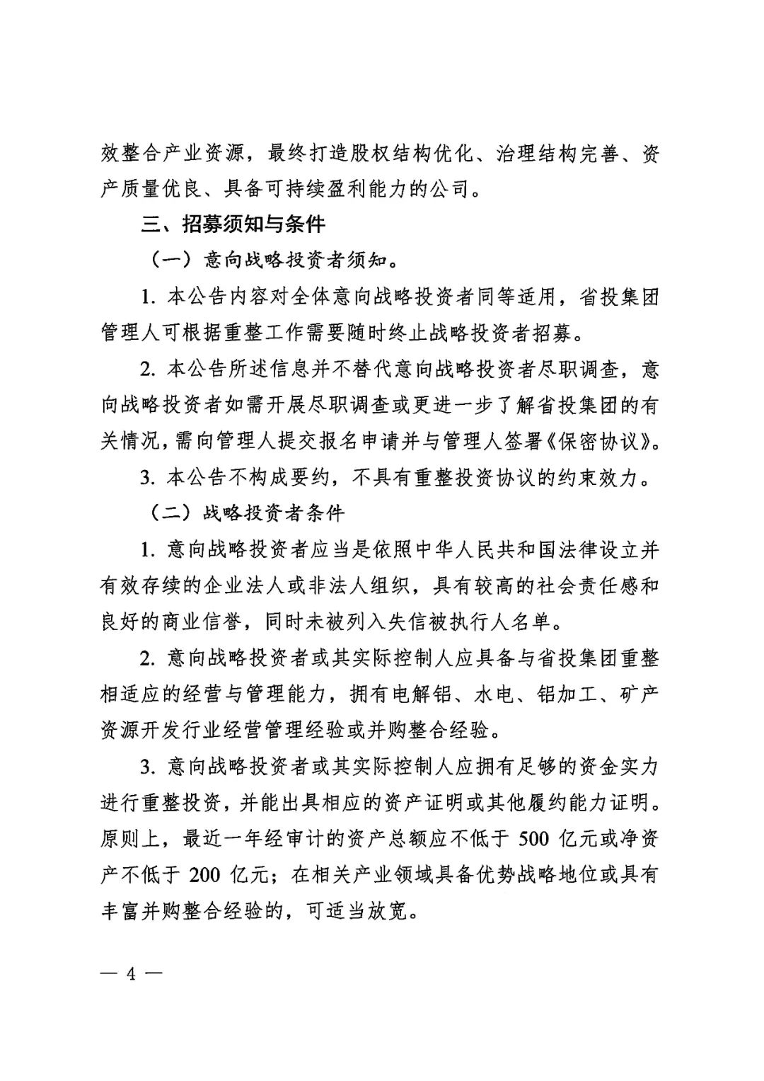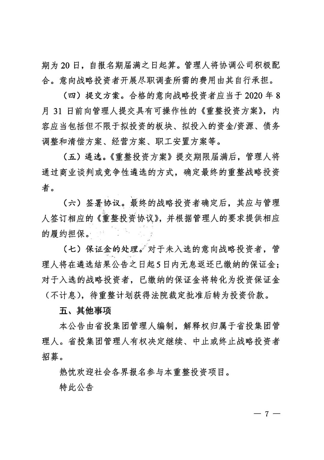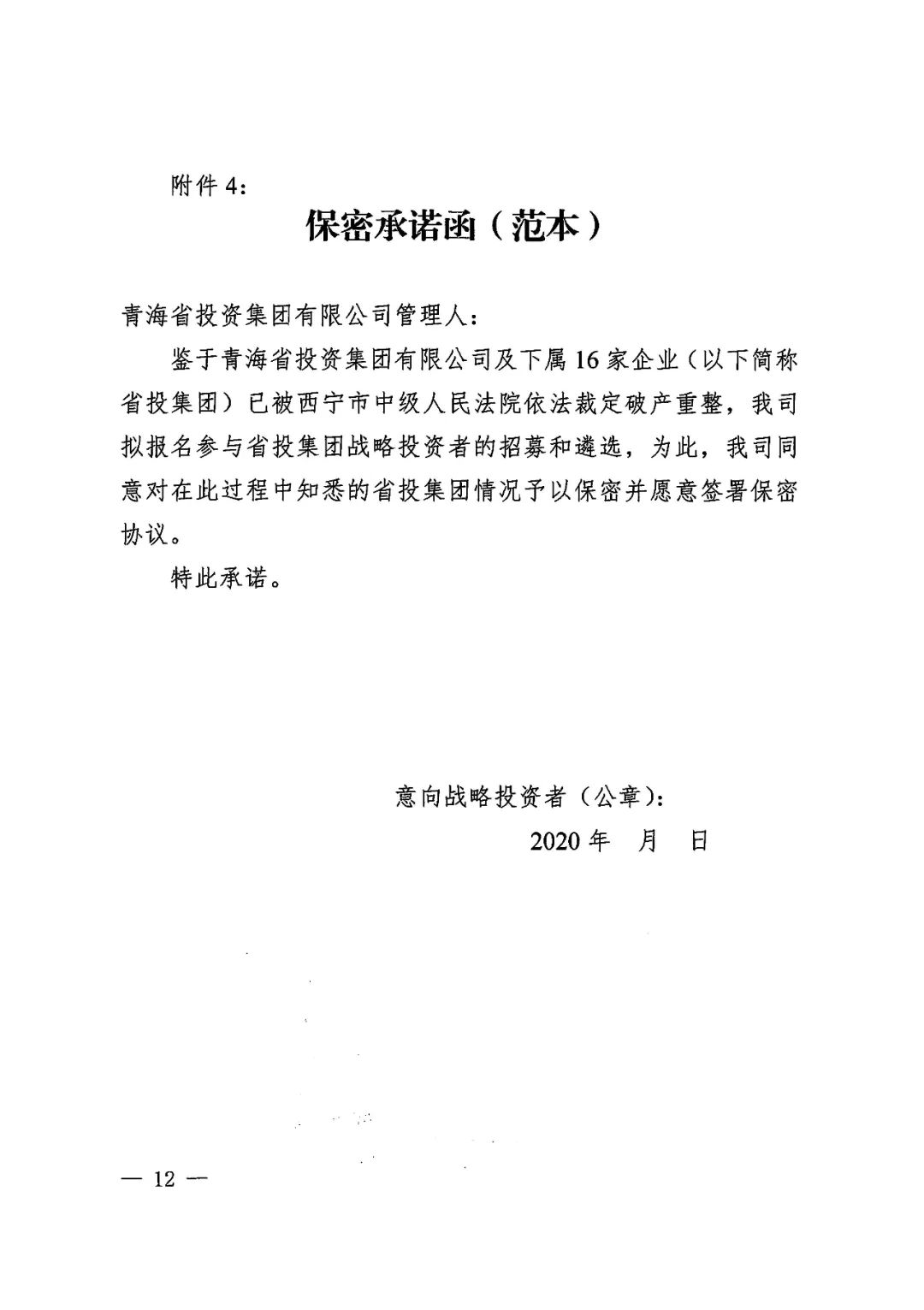 2020年6月19日,青海省西宁市中级人民法院依法分别裁定受理青海省投资集团有限公司及下属青海省三江水电开发股份有限公司、青海诚扬水电有限公司、青海和峰炭素有限公司、青海翔光物业有限公司、青海益星综合管理服务有限公司、青海百河铝业有限责任公司、青海西部水电有限公司、青投国际贸易(上海)有限公司、青海青投国际贸易有限公司、青海国鑫铝业股份有限公司、青海平安高精铝业有限公司、青海桥电实业有限公司、青海桥头发电有限责任公司、青海桥头铝电股份有限公司、青海益和检修安装有限公司、青海宁北发电有限责任公司16家企业(以下合称“省投集团”)破产重整一案,并于同日指定管理人成员。为顺利推进省投集团重整工作,实现省投集团运营价值最大化,管理人依照《中华人民共和国企业破产法》及相关法律规定面向全国公开招募战略投资者,报名截止日期为2020年7月31日前(含当日),联系人为曾哲、史晓琪(199 9730 0757、199 9730 0380)。