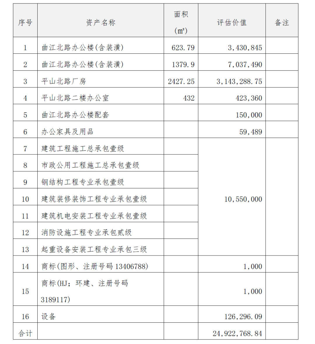 经对中机环建公司资产评估,管理人剥离的重整资产总评估价值为24,922,768.84元,具体评估价值情况如下表: