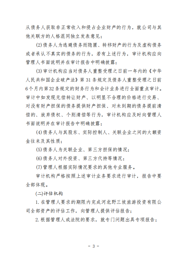 关于选聘河北野三坡旅游投资有限公司重整审计及评估机构的公告