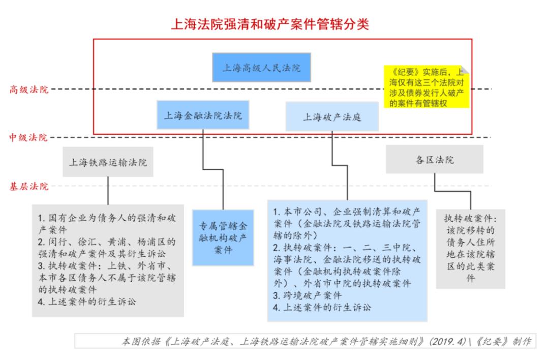 根据《企业破产法》及上海市法院系统的相关规定看,目前上海市对破产案件管辖形成了集中管辖与级别管辖相结合的模式。《纪要》实施后,包括上海铁路运输法院及各区法院在内的基层法院对于涉及债券发行人的破产案件将无管辖权。