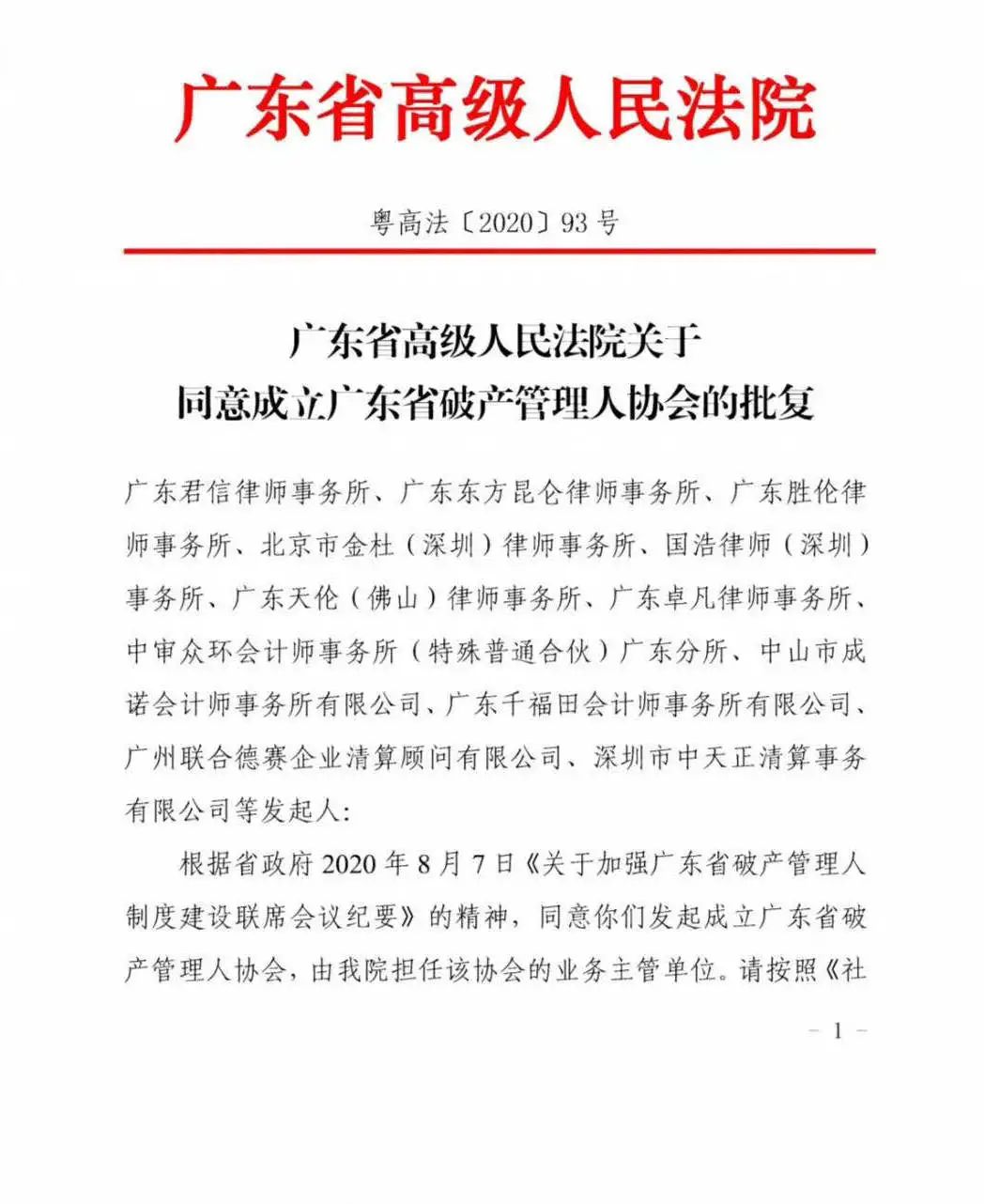 2020年9月7日,广东省高级人民法院发布了粤高法[2020]93号文件《关于同意成立广东省破产管理人协会的批复》,同意广东君信律师事务所、广东东方昆仑律师事务所、广东胜伦律师事务所、北京市金社(深圳)律师事务所、国浩律师(深圳)事务所、广东天伦(佛山)律师事务所、广东卓凡律师事务所、中审众环会计师事务所(特殊普通合伙)广东分所、中山市成诺会计师事务所有限公司、广东千福田会计师事务所有限公司、广东联合德赛企业清算顾问有限公司、深圳市中天正清算事务有限公司等发起人,发起成立广东省破产管理人协会,由广东省高级人民法院担任协会的业务主管单位。