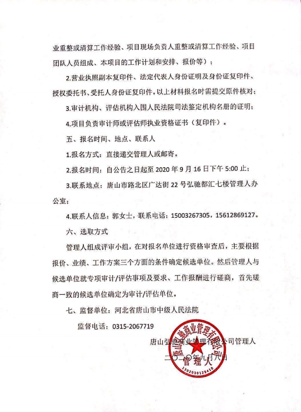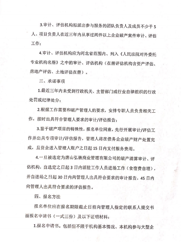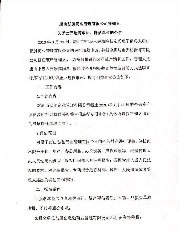 唐山弘驰商业管理有限公司管理人 关于公开选聘审计、评估单位的公告