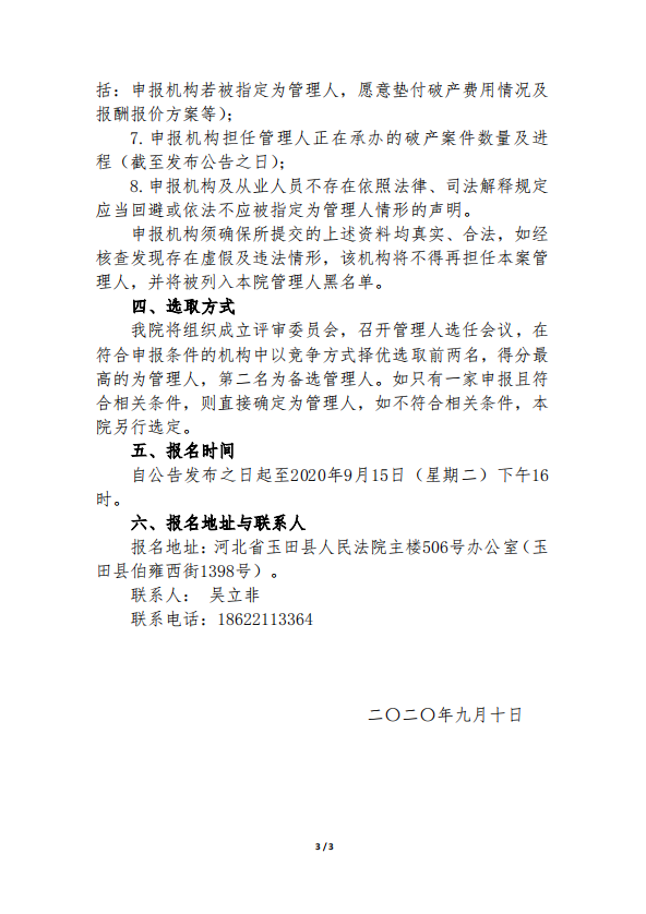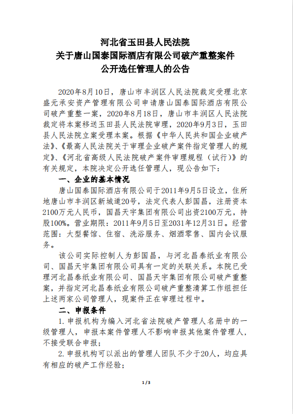 河北省玉田县人民法院 关于唐山国泰国际酒店有限公司破产重整案件公开选任管理人的公告