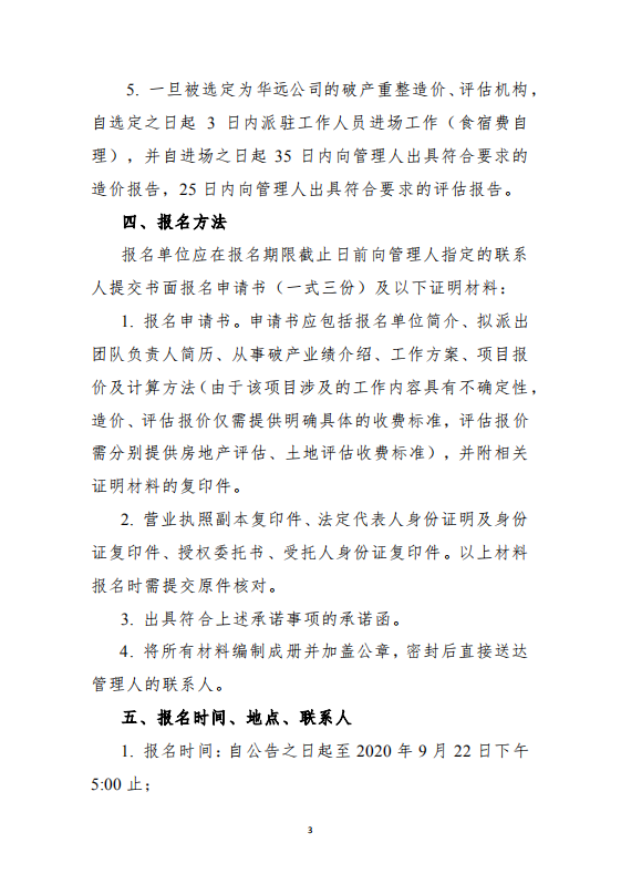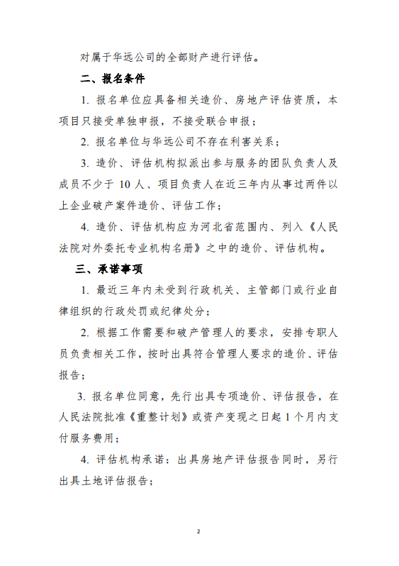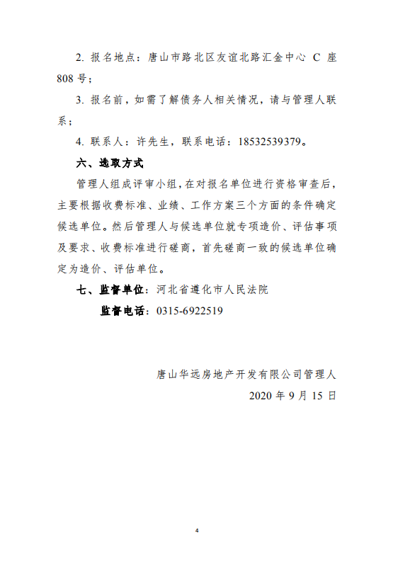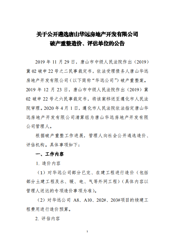 关于公开遴选唐山华远房地产开发有限公司 破产重整造价、评估单位的公告