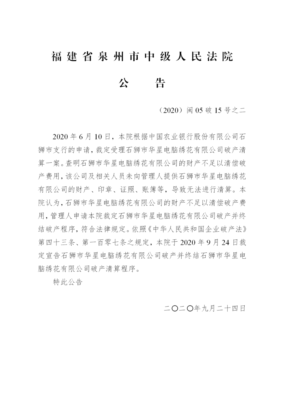 石狮市华星电脑绣花有限公司破产清算一案终结公告