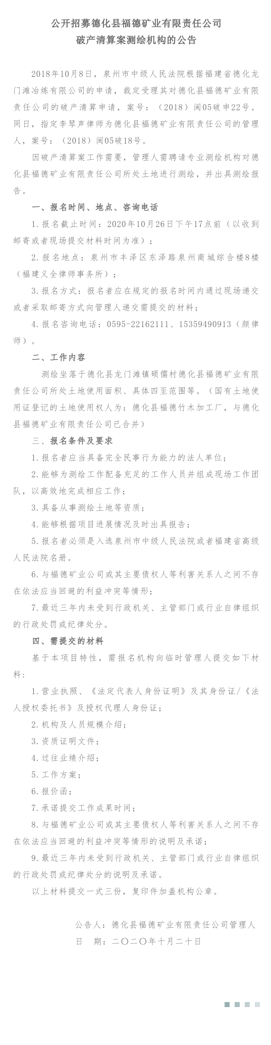 公开招募德化县福德矿业有限责任公司破产清算案测绘机构的公告