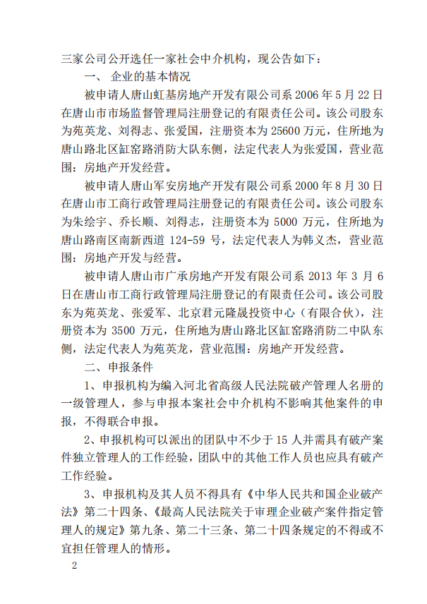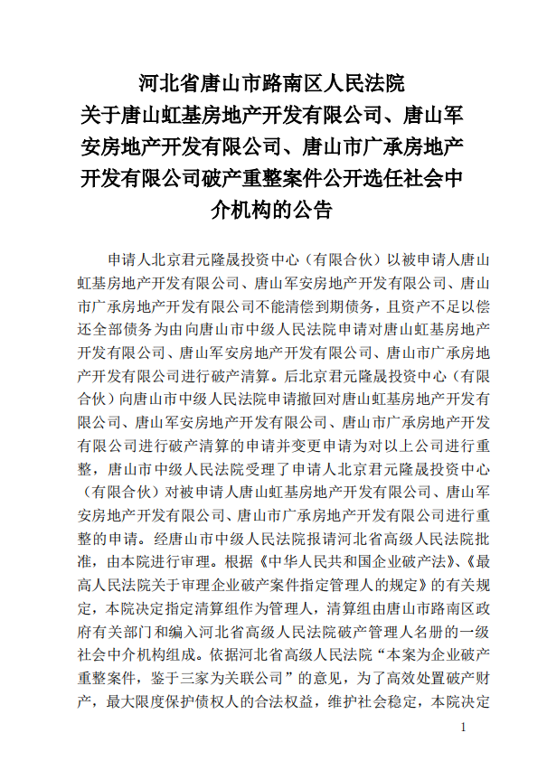 关于唐山虹基房地产开发有限公司、唐山军安房地产开发有限公司、唐山市广承房地产开发有限公司破产重整案件 公开选任社会中介的公告