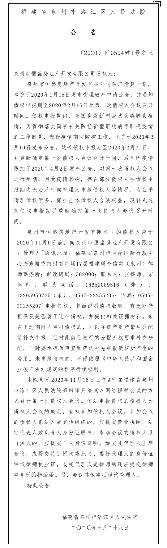 泉州市恒盛房地产开发有限公司债权申报公告
