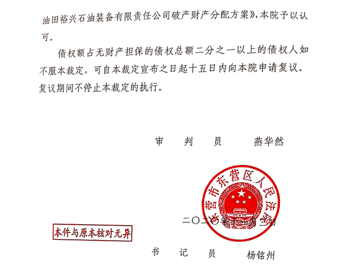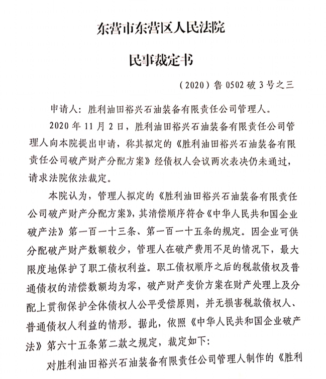 胜利油田裕兴石油装备有限责任公司破产财产分配方案——民事裁定书