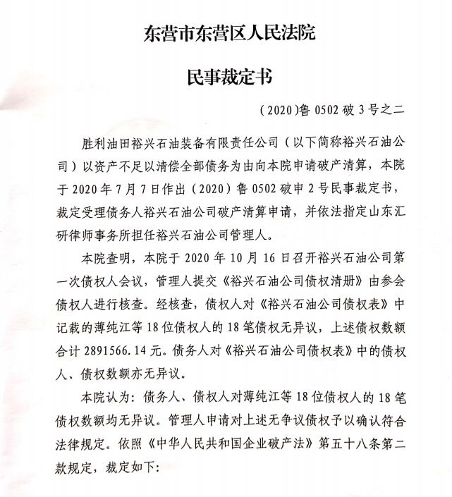 胜利油田裕兴石油装备有限责任公司破产清算——民事裁定书